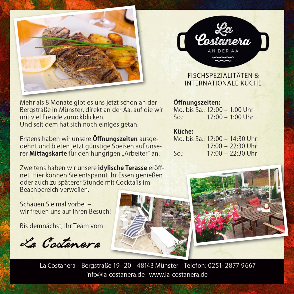Das La Costanera ist ein vorzügliches Fischrestaurant, das die peruanischen Wurzeln der Inhaber in die Speisen mit einbringt. Für einen gelungenen Start in die münsterische Gastronomie habe ich die Gestaltung übernommen.